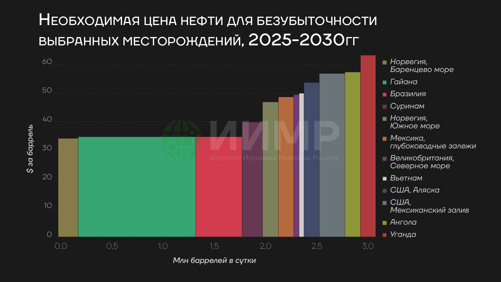 Цена на нефть, необходимая для выхода на безубыточность новых нефтяных проектов, варьируется в широком диапазоне. По оценкам Bloomberg, цена безубыточности для высокозатратных новых проектов составляет от 57 до 63 долларов за баррель.