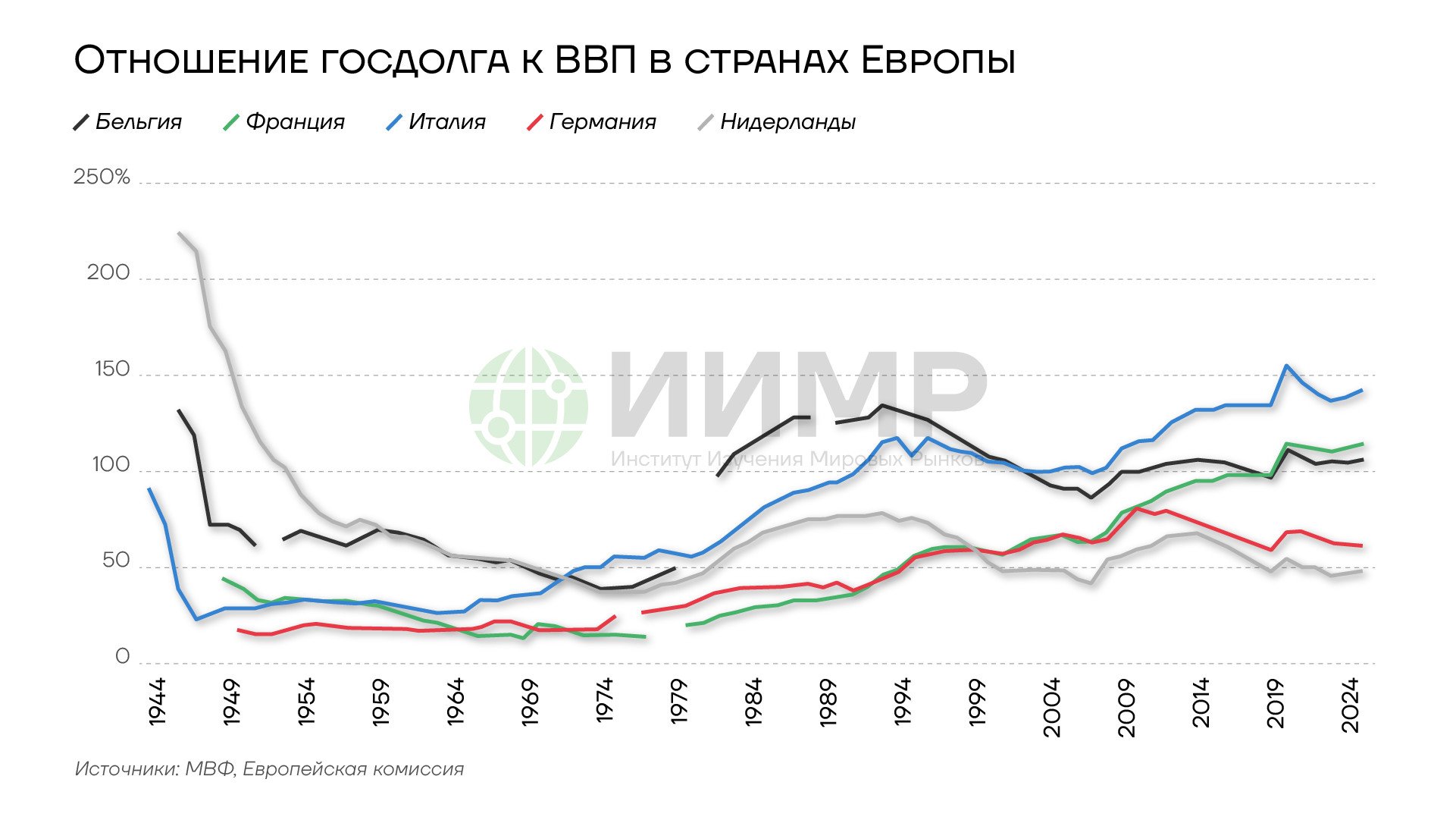 Отношение госдолга к ВВП в странах Европы, 1944-2024гг