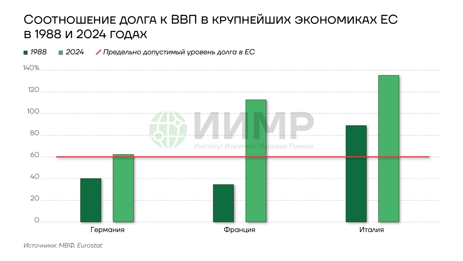 Соотношение долга к ВВП в крупнейших экономиках ЕС в 1988 и 2024 годах