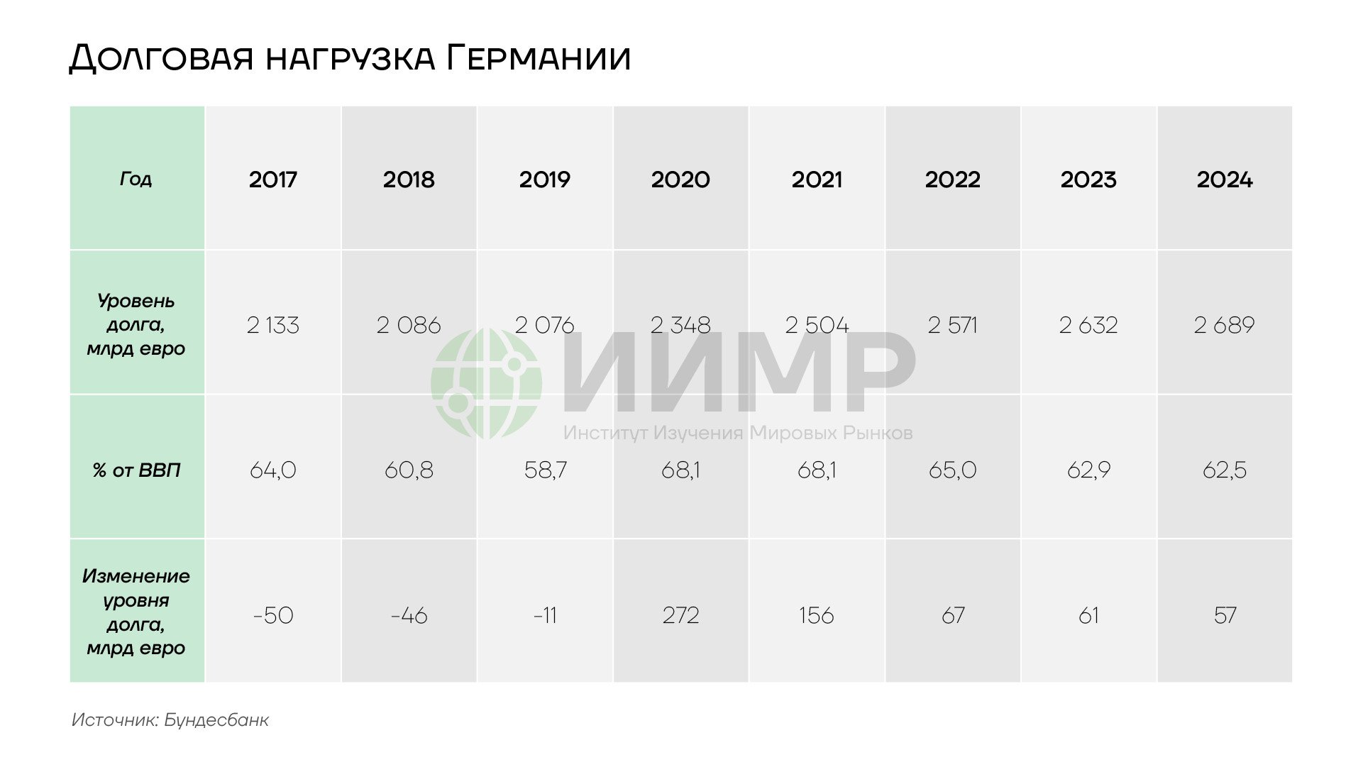 В марте 2025 года Германия одобрила смягчение так называемого «долгового тормоза» — закрепленного в национальной конституции механизма, который был призван ограничивать структурный дефицит федерального бюджета на уровне 0,35% ВВП. Теперь расходы на оборону, превышающие 1% ВВП, будут исключены из этих расчетов. Требования к сбалансированности региональных бюджетов также были смягчены. Землям Германии разрешили привлекать новые чистые заимствования в размере до 0,35% ВВП в год, как это ранее было на федеральном уровне. Кроме того, реформа предусматривает создание нового инфраструктурного фонда на 500 млрд евро (11,6% ВВП на 2024 год) вне рамок «долгового тормоза». Фонд предназначен для финансирования новых проектов в области транспорта, здравоохранения, энергетики, образования, научных исследований и цифровизации. Скачок доходности немецких облигаций показывает, что рынки ожидают роста объемов заимствований со стороны Берлина.