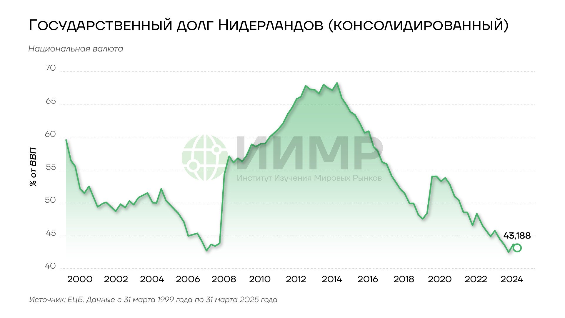 Ожидается, что рост реального ВВП Нидерландов в 2025 году ускорится до 1,3%, поскольку повышение заработной платы и, как следствие, увеличение реальных располагаемых доходов поддержат частное потребление. Однако в 2026 году экономический рост замедлится до 1,2% на фоне возросшей неопределенности и влияния американских пошлин на торговлю. При этом дефицит бюджета Нидерландов, по прогнозам Еврокомиссии, в 2026 году увеличится до 2,7%. В условиях расширения дефицита госдолг вырастет до 45% ВВП в 2025 году и 47,8% ВВП в 2026 году, что все еще будет ниже среднего показателя по еврозоне.