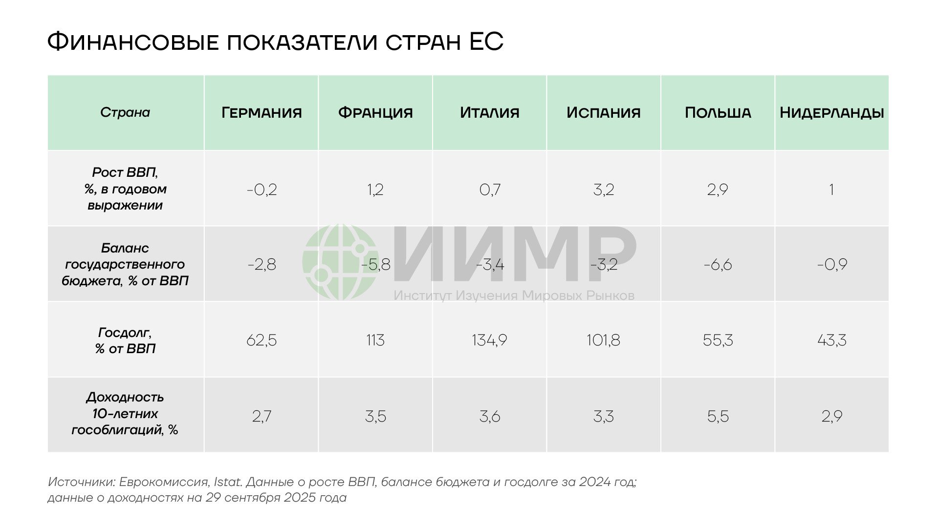 Огромный итальянский госдолг, второй по величине в еврозоне после Греции по отношению к ВВП, долгое время рассматривался как ключевая угроза устойчивости блока, в то время как темпы экономического роста в Италии оставались хронически низкими. Ожидается, что к 2026 году долг вырастет до около 138% ВВП. Если же экономический рост в 2025 году окажется значительно ниже целевого показателя правительства в 1,2%, что весьма вероятно, то соотношение долга к ВВП увеличится еще больше. Согласно прогнозам ОЭСР, рост третьей европейской экономики в 2025 году замедлится до 0,6% по сравнению с 0,7% в 2024 году, после чего вновь ускорится до 0,7% в 2026 году. Замедление экономического роста может ослабить рыночный спрос на итальянские облигации, что увеличит стоимость обслуживания долга для правительства.