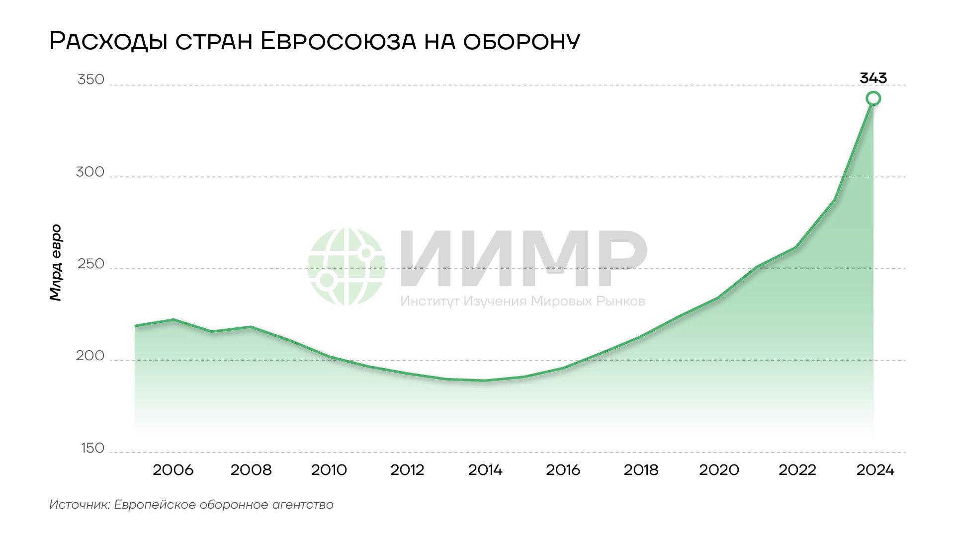 Рост оборонных расходов на фоне конфликта на Украине и усиления НАТО также стимулирует увеличение долгового бремени европейских государств. В 2024 году оборонные расходы членов ЕС увеличились десятый год подряд и достигли 343 млрд евро, что на 19% больше по сравнению с предыдущим годом и на 37% больше, чем в 2021 году. Ожидается, что в 2025 году они достигнут 381 млрд евро.