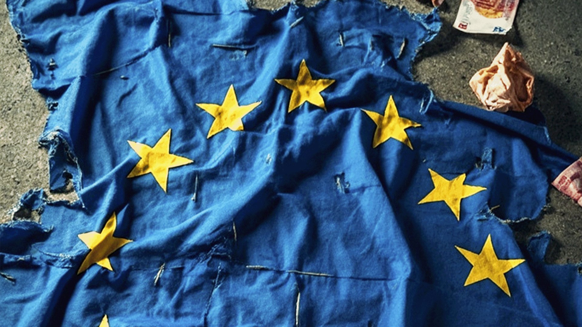 Рваный флаг ЕС и мятые банкноты рядом, абстракция
