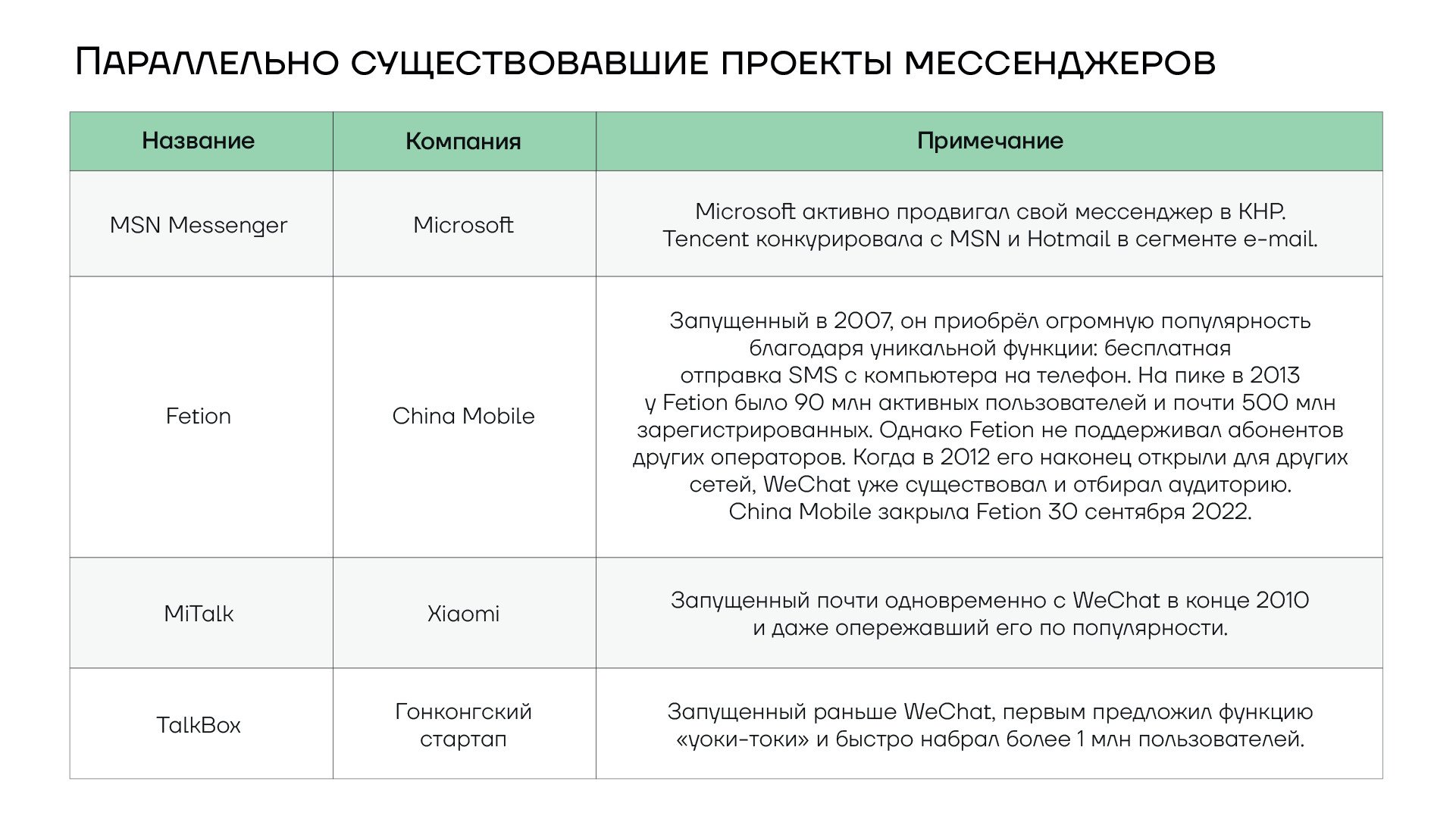 - Fetion — мессенджер от China Mobile, крупнейшего оператора связи Китая. Запущенный в 2007, он приобрёл огромную популярность благодаря уникальной функции: бесплатная отправка SMS с компьютера на телефон. На пике в 2013 у Fetion было 90 млн активных пользователей и почти 500 млн зарегистрированных. Однако Fetion не поддерживал абонентов других операторов. Когда в 2012 его наконец открыли для других сетей, WeChat уже существовал и отбирал аудиторию. China Mobile закрыла Fetion 30 сентября 2022.