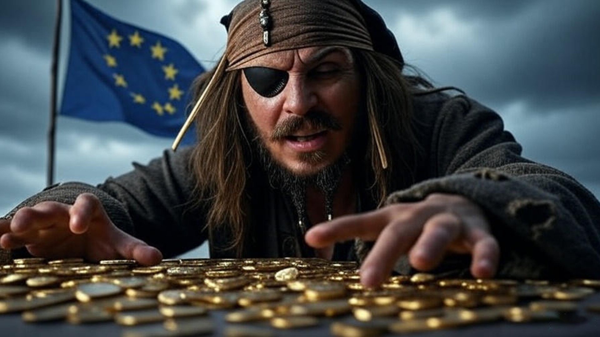 Пират тянется за золотом на фоне флага ЕС (абстракция)