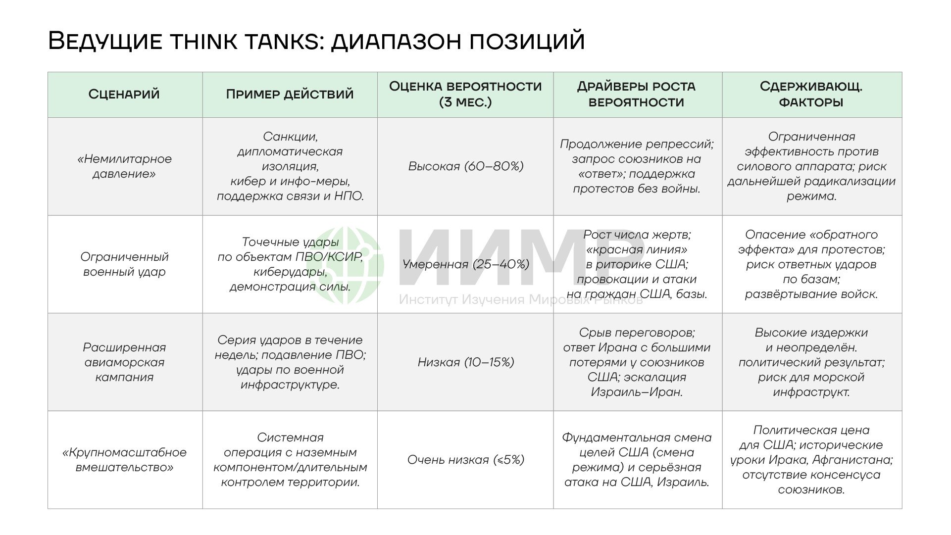 Сценарии развития ситуации вокруг Ирана в первой половине 2026 года: оценка взглядов ведущих аналитических центров (think tanks), риск перекрытия Ормузского пролива и последствия для нефтяного рынка.