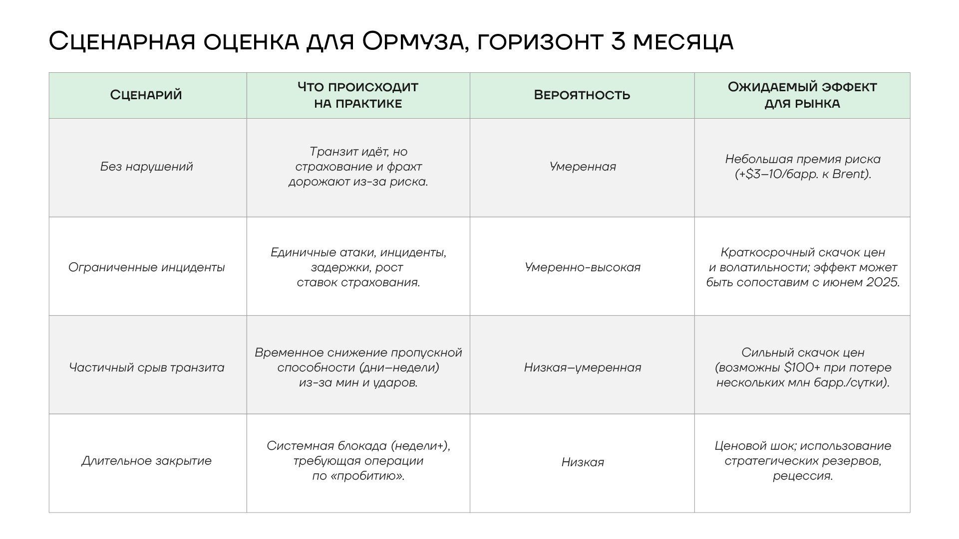 Наиболее вероятен сценарий ограниченных инцидентов, поскольку он позволяет Ирану оказывать давление без провоцирования полного военного ответа. Опыт июня 2025 года подтверждает: даже ожидание перекрытия привело к скачку Brent с 70 до 78 долларов за баррель, после перемирия котировки быстро откатились.