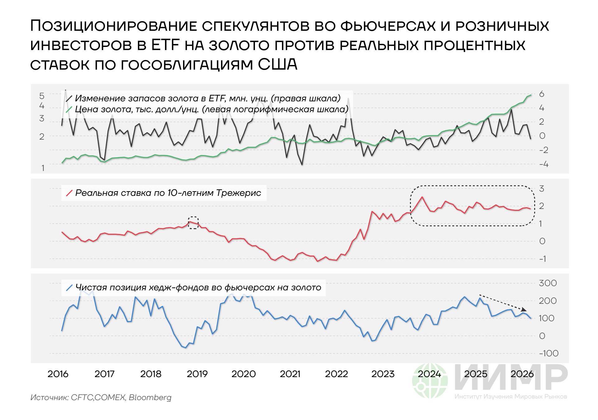 Позиционирование спекулянтов во фьючерсах и розничных инвесторов в ETF на золото против реальных процентных ставок по гособлигациям США. 2016-2025ГГ
