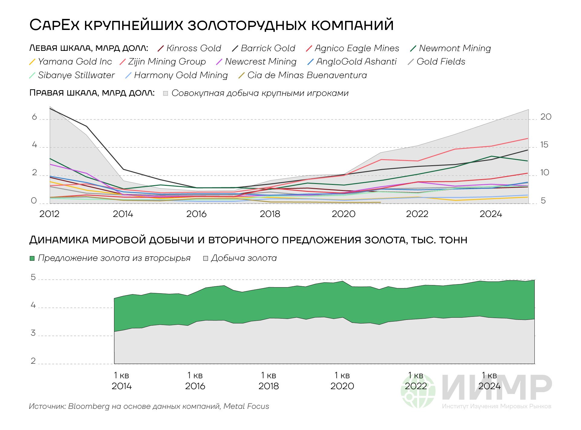 Важным долгосрочным фактором роста цен на металл стала масштабная недоинвестированность в добычу золоторудных компаний — «дешевого» золота в недрах не осталось. При ценах в $1200–2000 за унцию за десятилетие перед 2024 годом до половины компаний оперировали на границе своей себестоимости. А инвесторы давили на менеджмент старателей, требуя выплат дивидендов или выкупа акций вместо инвестиций в добычу.
