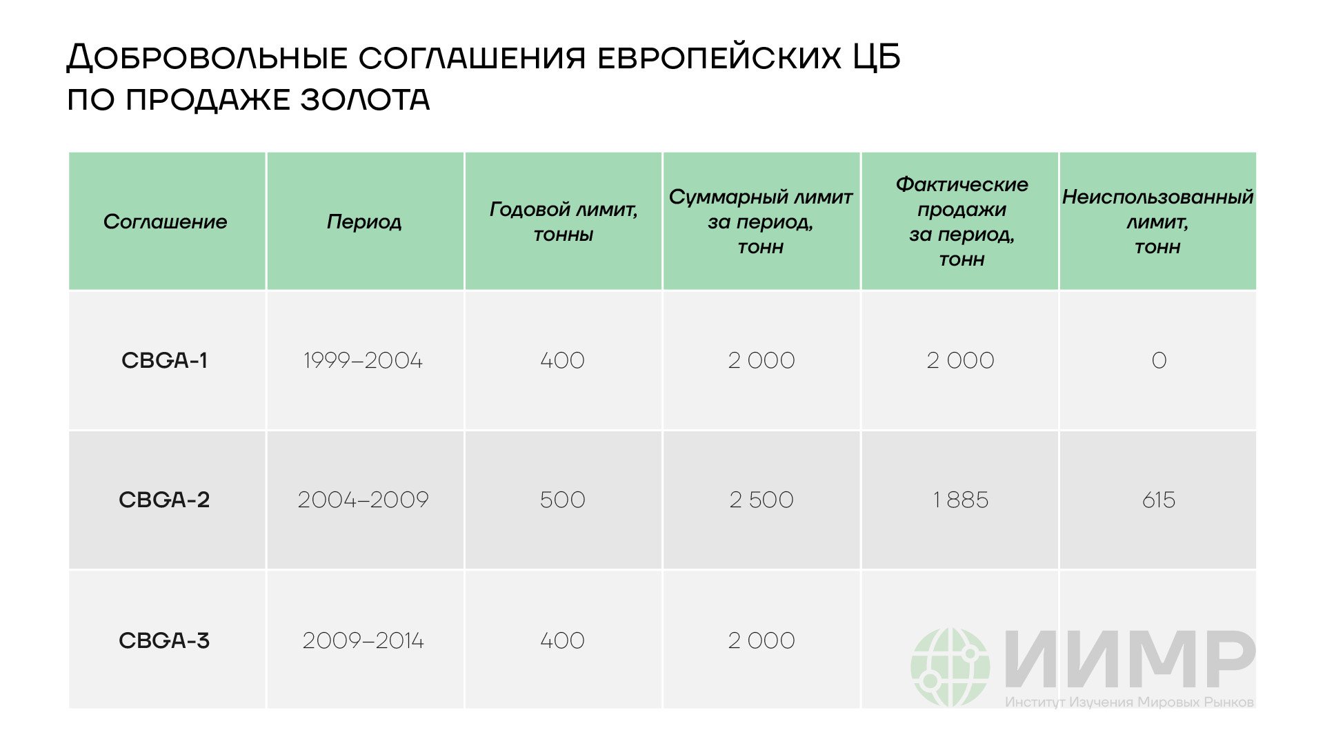 В конце 1990-х несколько ЦБ европейских стран провели крупные распродажи золота из своих резервов, что привело к росту волатильности на рынке и потребовало создания в 1999 году добровольного соглашения (CBGA) с лимитами на продажи и операции с золотом. Это соглашение потом продлевалось еще два раза, вплоть до 2014 года, но в реальности продажи были свернуты еще в 2009 году.