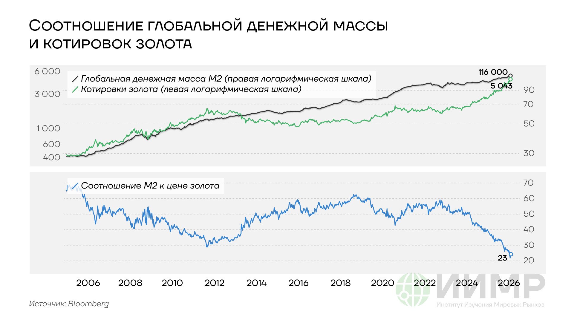 Соотношение глобальной денежной массы и котировок золота, 2006-2026гг