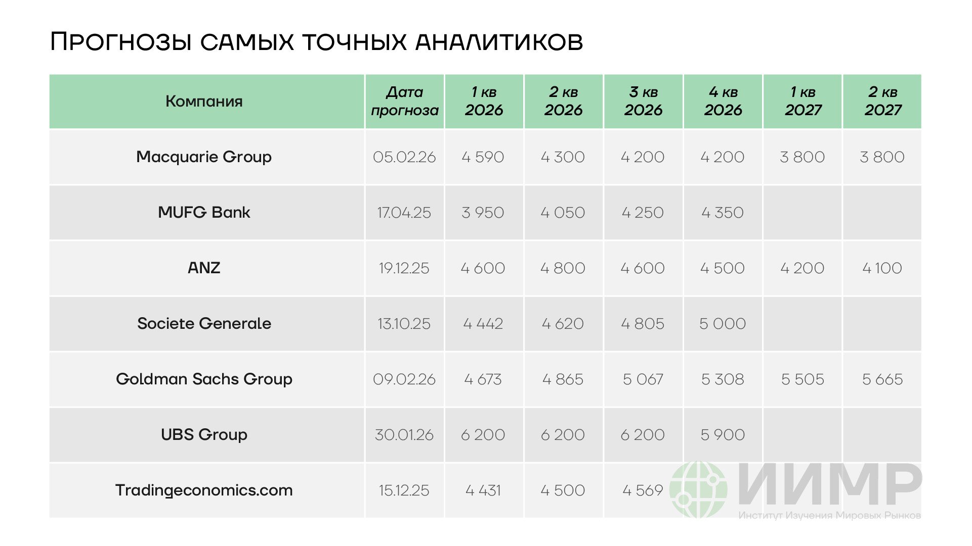 При этом есть уже индивидуальные прогнозы и выше $6000 за унцию (JP Morgan, UBS), равно как и ожидания обвала — $3800 через год от Macquarie. По оценке Bloomberg, самые хорошие прогнозисты цен на золото работают как раз таки в австралийских Macquarie (ждут $4590 в 1 квартале 2026 года и дальше вниз к $3800), а также в ANZ (тоже вниз с $4600 на $4100).