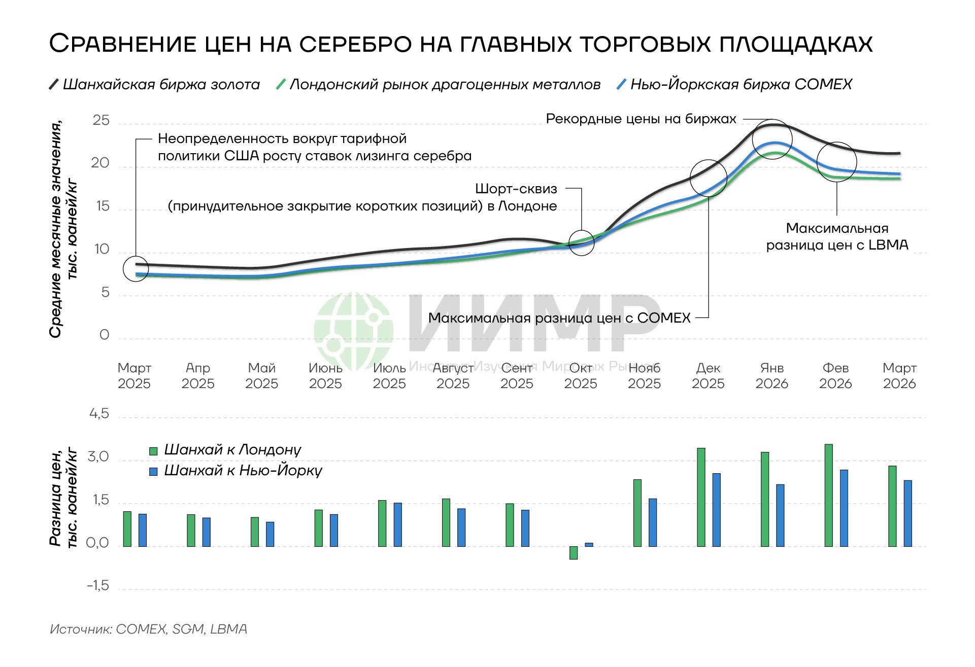 Переток серебра в Китай устроен существенно сложнее. На Шанхайской бирже золота (SGE) основным инструментом торговли серебром является контракт Ag(T+D) — отложенный по исполнению контракт с лотом в 1 кг, котируемый в юанях за килограмм. На Шанхайской фьючерсной бирже (SHFE) торгуется фьючерсный контракт с лотом в 15 кг и поставочной единицей в 30 кг, причем к поставке допускаются слитки чистотой не ниже 99,99%. Для сравнения, стандартный контракт COMEX предусматривает поставку 5000 унций (около 155,5 кг) в виде пяти слитков по 1000 унций чистотой не ниже 99,9%, а лондонский стандарт LBMA Good Delivery оперирует аналогичными слитками.