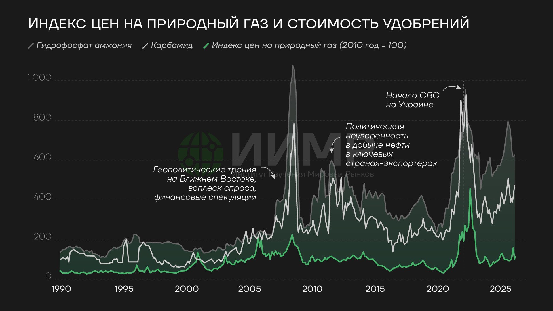 Цены на природный газ и стоимость удобрений, 1990-2025гг