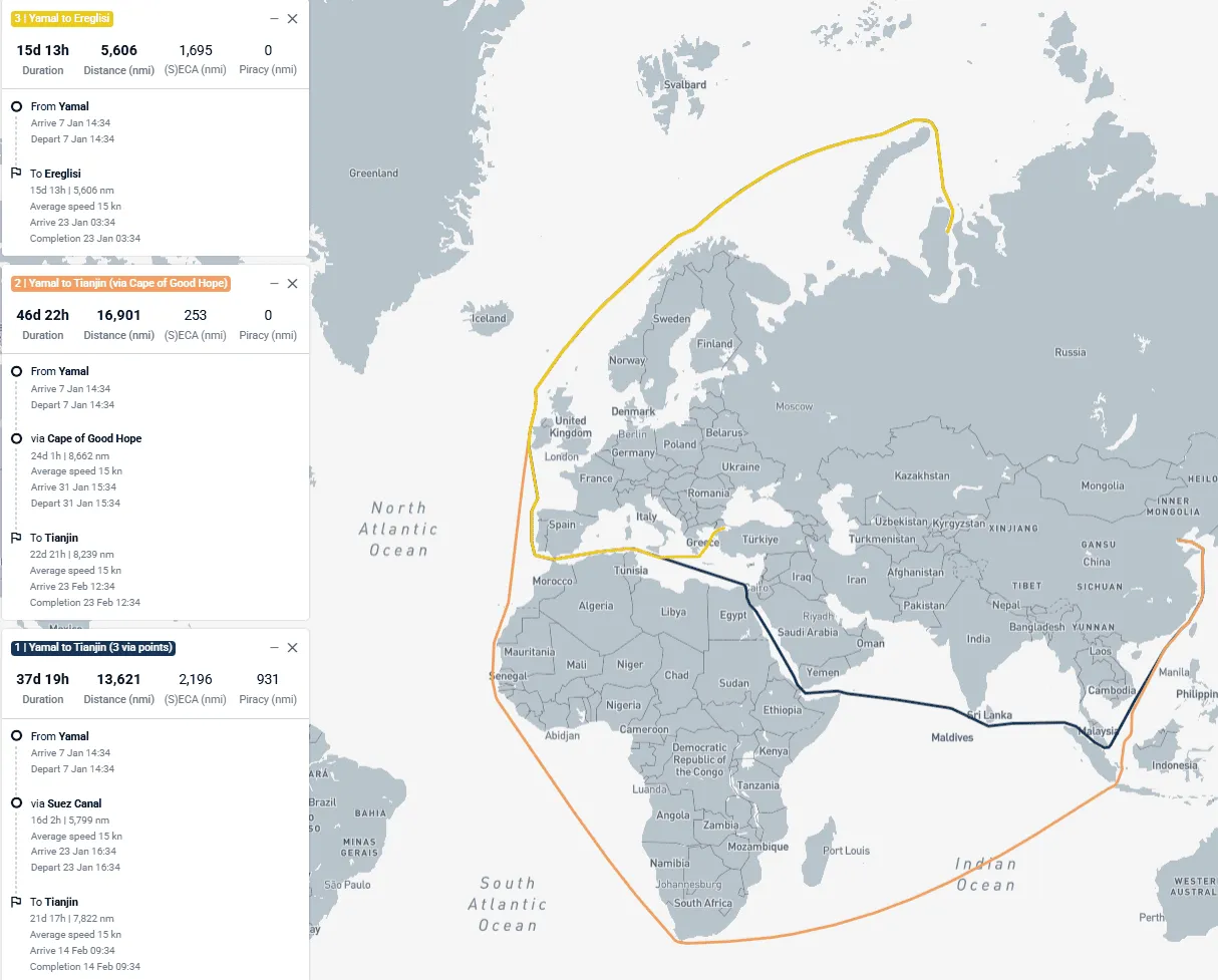 При этом дополнительным фактором риска для экспорта из России – по сравнению с поставками из США и Австралии – становятся террористические атаки. Атака на газовоз "Арктик Метагаз" 3 марта 2026 года вблизи острова Мальта в Средиземном море вполне наглядно продемонстрировала, что танкеры, которые следуют под российским флагом, могут подвергнуться нападению. Газовоз следовал в Китай через Средиземное море, однако не смог доставить свой груз в конечную точку назначения. В компании Kpler, в частности, отметили, что поставки СПГ с российского полуострова Ямал через мыс Доброй Надежды в среднем занимают на 9–10 дней больше по сравнению с поставками через Суэцкий канал.