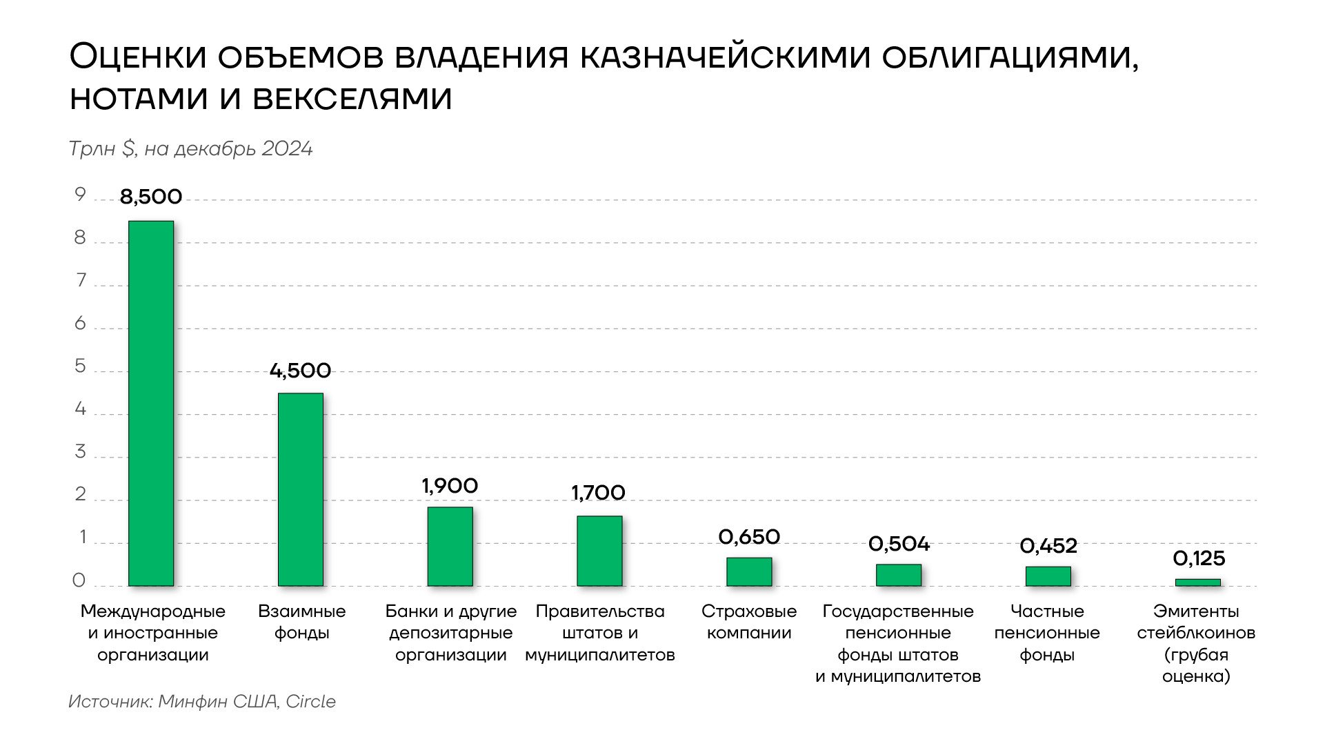 Распределение казначейских бумаг между категориями инвесторов указывает на скромные на текущий момент позиции эмитентов стейблкоинов. Страховой сектор владеет приблизительно 650 млрд долларами госдолга — пятикратное превышение над стейблкоин-эмитентами, взаимные фонды концентрируют около 4,5 трлн — в 36 раз больше.