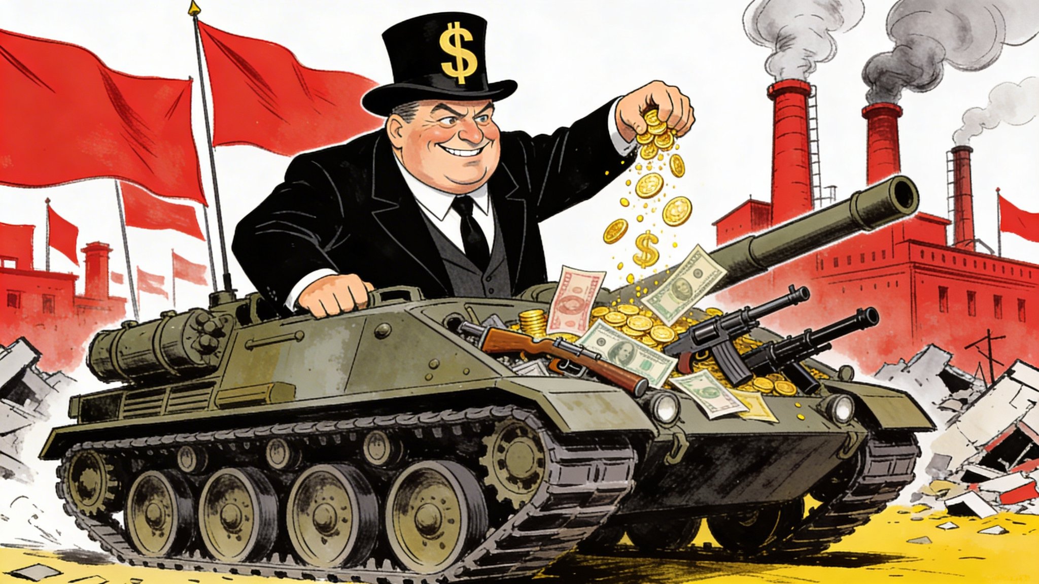Американский банкир, верхом на танке посыпает его золотом и деньгами, карикатура