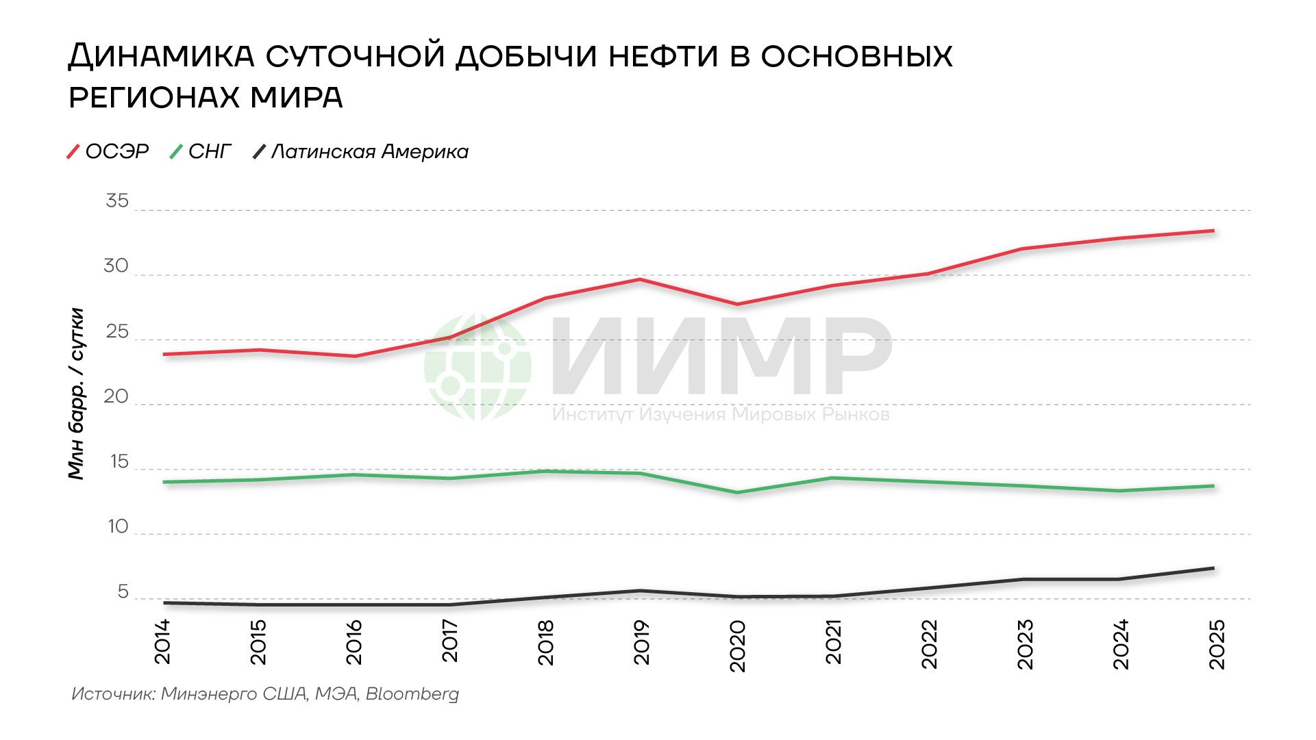 Динамика суточной добычи нефти в основных регионах мира, 2014-2025гг
