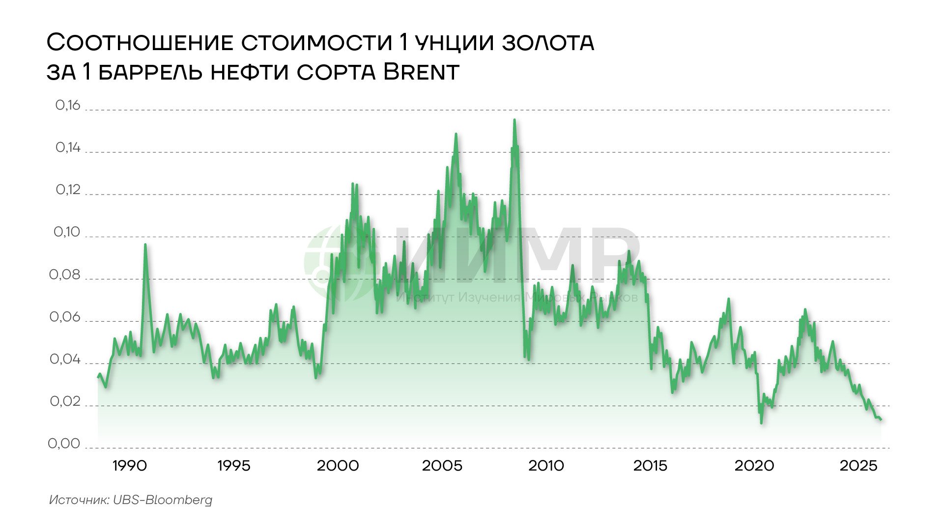 Соотношение стоимости 1 унции золота и 1 барреля нефти сорта Brent, 1990-2025гг