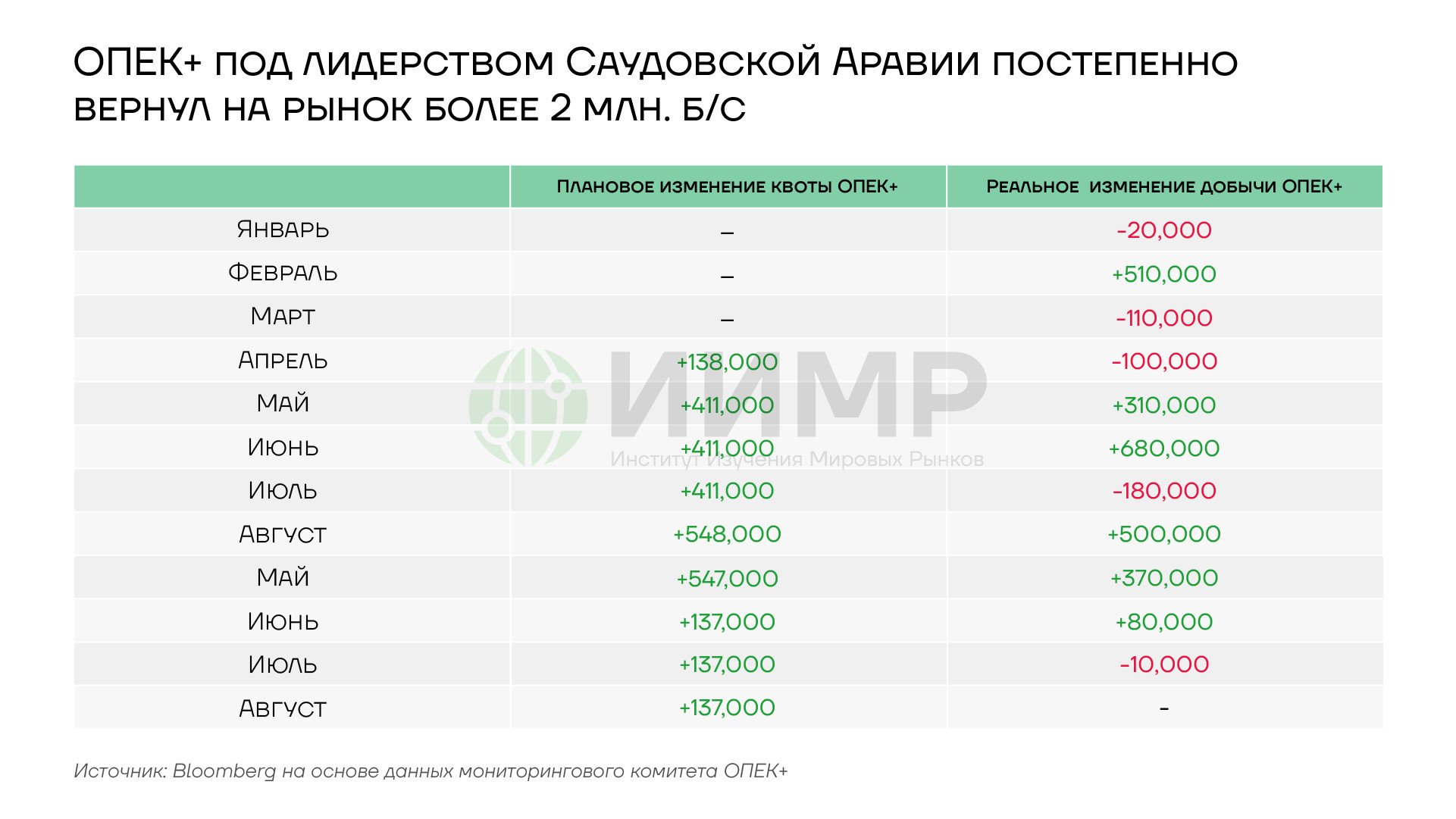 Основными каналами реализации новой стратегии С.Аравии стали увеличение добычи ОПЕК+ за счет постепенного отката добровольного сокращения добычи сверх установленных квот и снижение официальной рекомендованной цены (OSP) на свою нефть, особенно для покупателей из Азии. С начала прошлого года ОПЕК+ вернул на рынок более 2 млн. б/с реальной добычи (>1 млн. одна только С.Аравия) и 2,87 млн. б/с «разрешенной добычи», т.е. де-факто, было проведено увеличение квот на добычу почти на 3 млн. б/с.