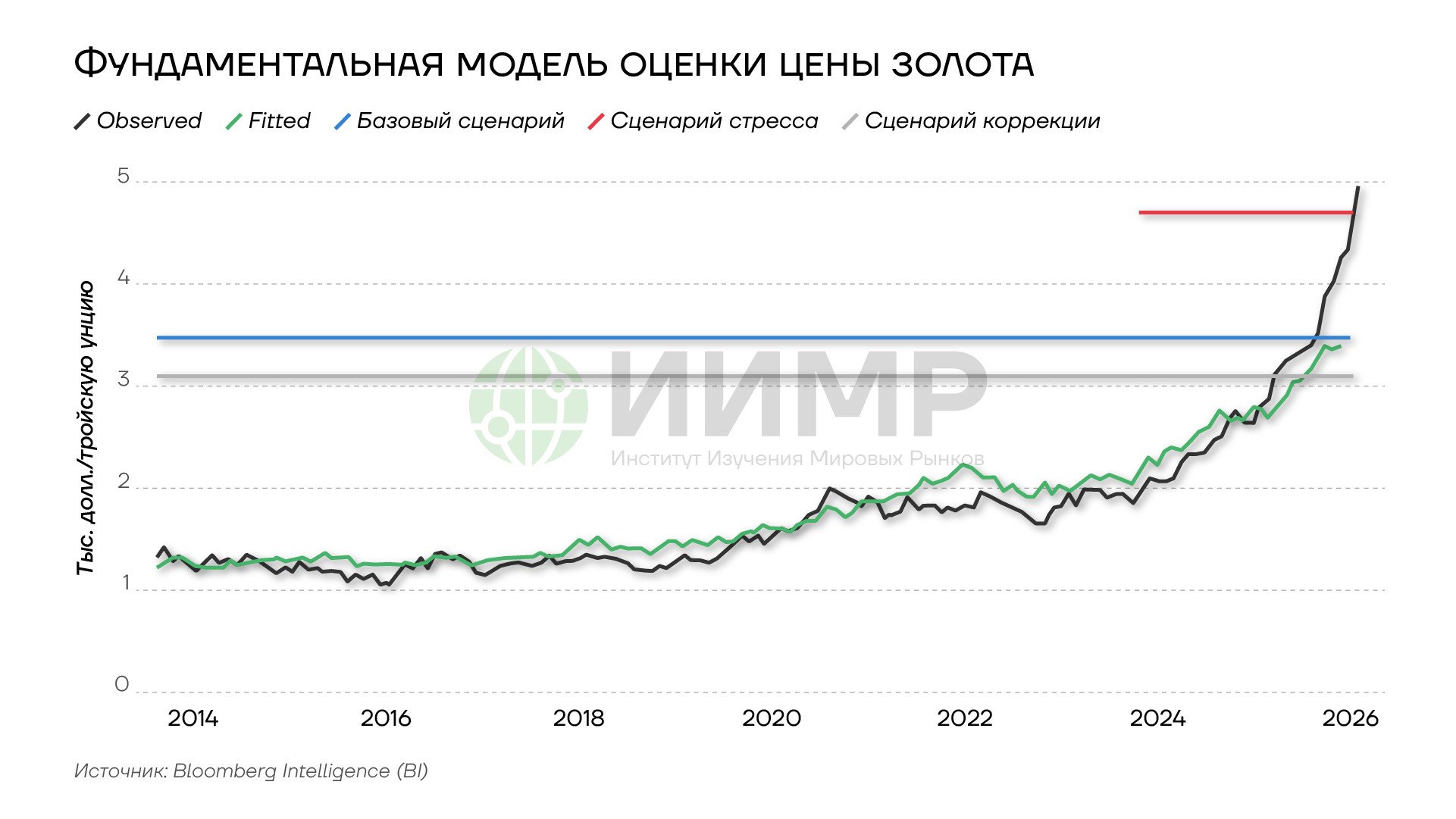 И при ценах выше $5000 за унцию даже стрессовый сценарий остается далеко позади рыночной цены, не говоря уже про текущую оценку модели около $3500.